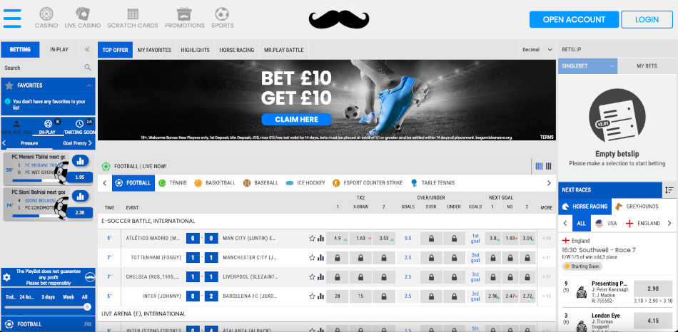 Mr Play is a moustache-themed casino and sportsbook that runs an Android betting app. At the sportsbook, you can enjoy a £10 free bet, as well as the ability to wager on numerous sports like football, basketball, baseball, tennis, volleyball and so much more. There’s also the Mr Play Casino app with live casino, slots, and more if you’d like to round off your experience, and you can check details of the casino in our Mr Play review here.
